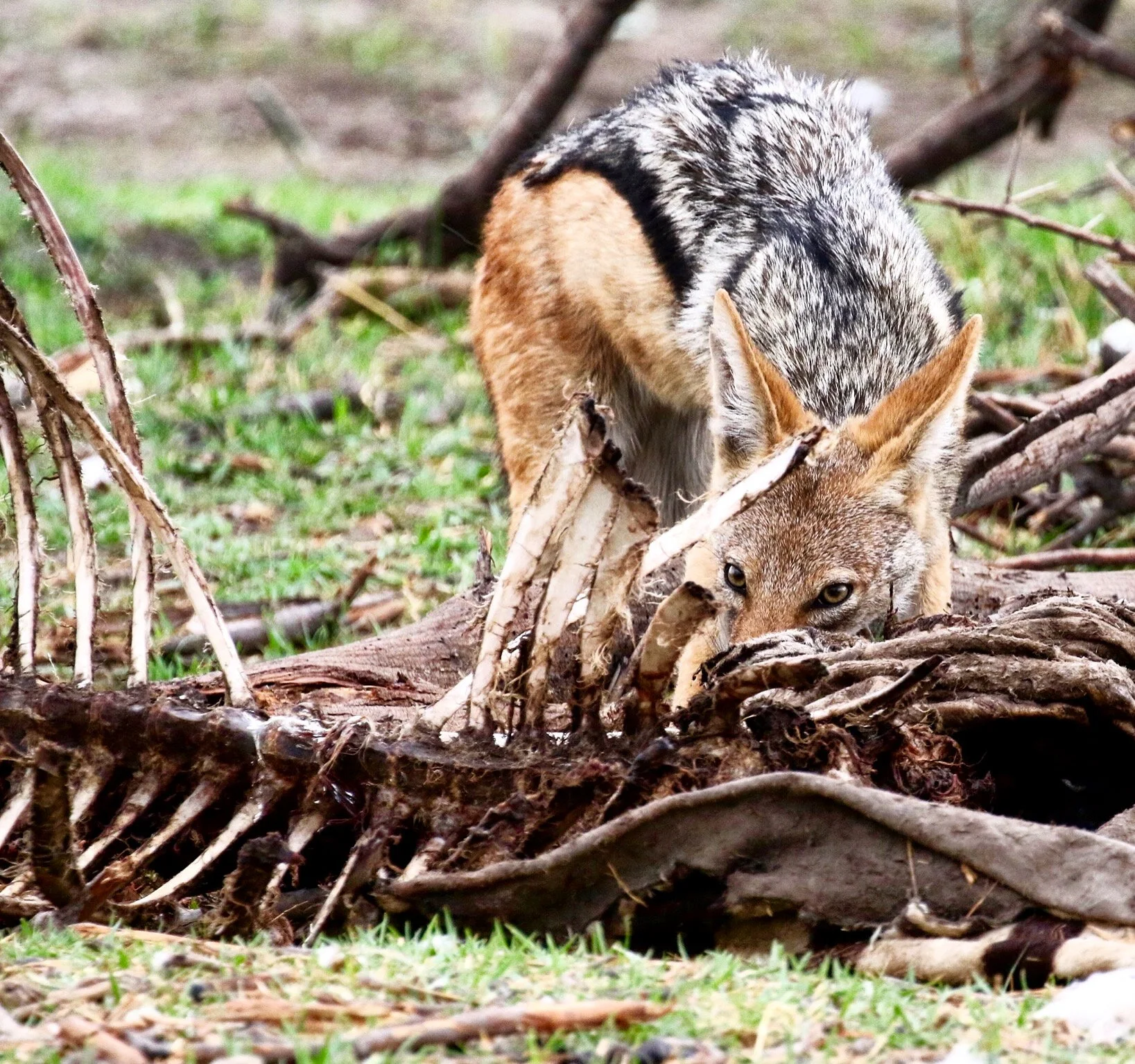 A black backed jackal takes advantage of zebra scraps by the water’s edge